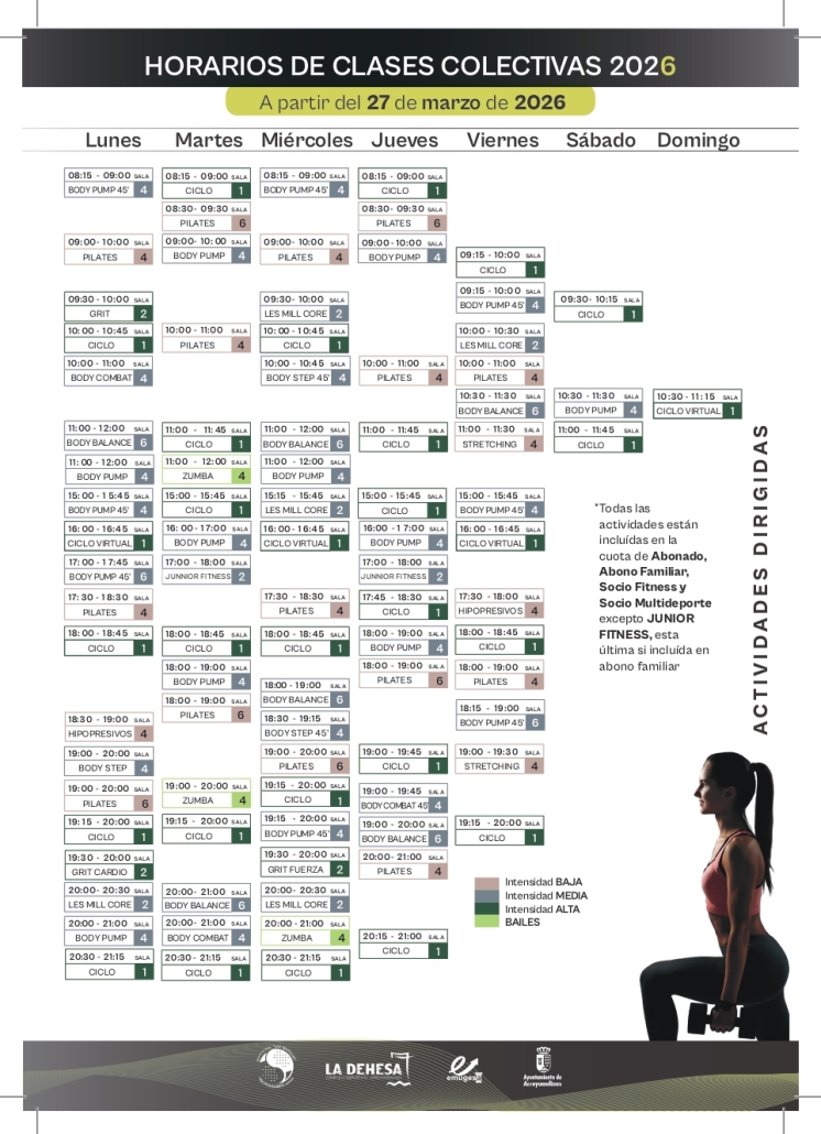 Nuestro gimnasio cuenta con un amplio y diverso programa de actividades colectivas distribuidas en todo el horario de apertura de las instalaciones con cerca de 100 clases semanales enfocadas a diferentes objetivos de tonificación, mejora cardio-vascular, corrección postural, etc. de acuerdo al siguiente horario.