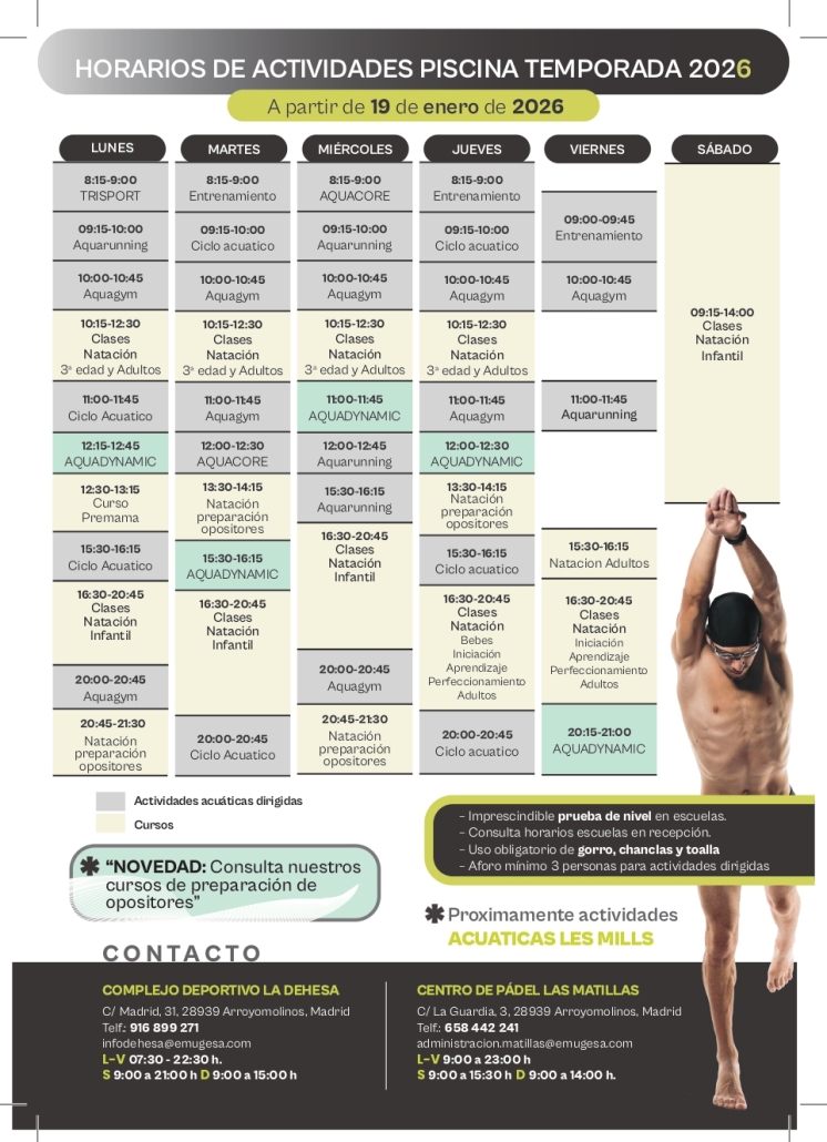 Actividad que se distribuye en diferentes grupos según el nivel de habilidad acuática, desde iniciación hasta perfeccionamiento.